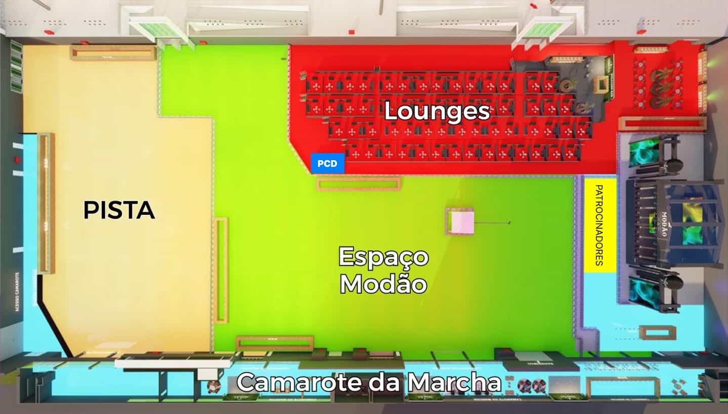 Voltado para um público mais exigente, que preza pelo conforto e comodidade, o CAMAROTE DA MARCHA é um espaço customizado que fica localizado no mezanino do EXPOMINAS. Do alto, a vista para o palco e para a pista é incrível.